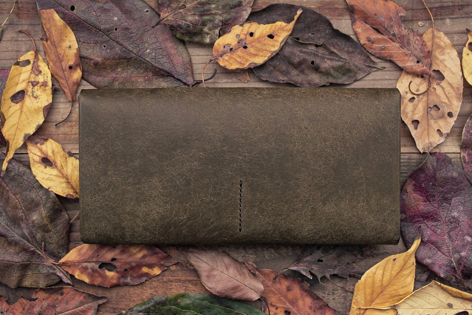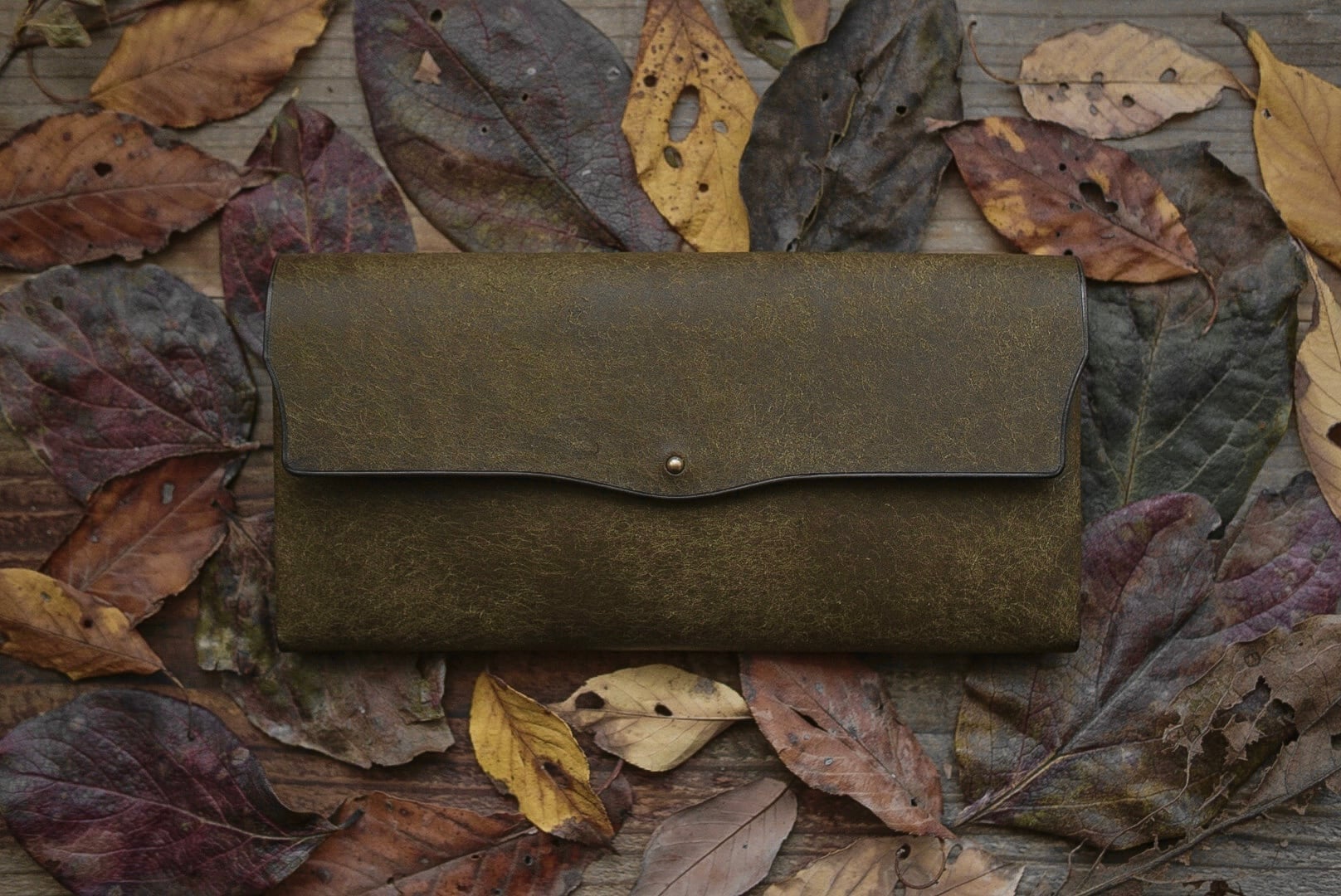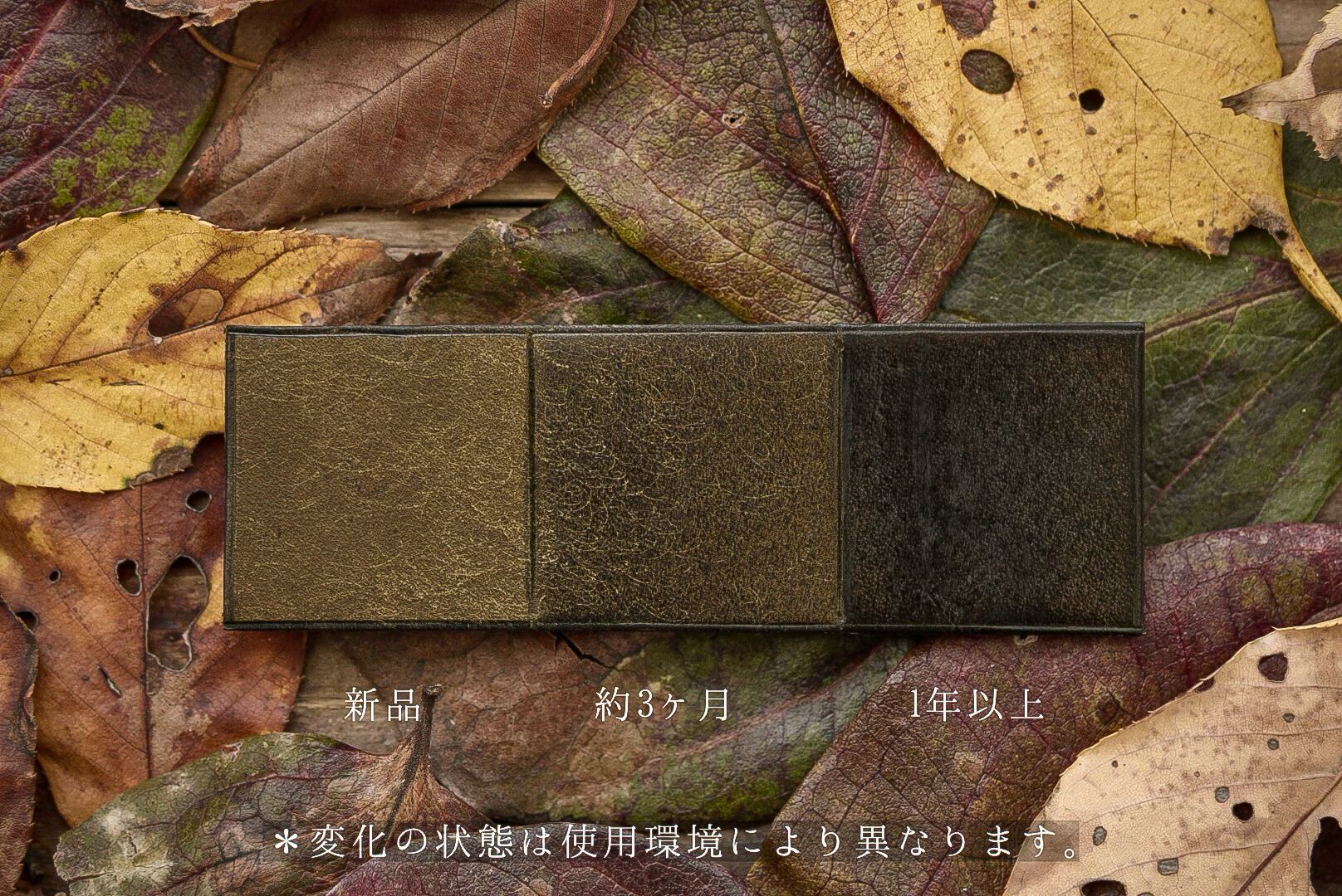 こちらの{古葉}はマットな質感のオリーブから、深く上品な艶と茶味を帯びた暗いオリーブグリーンへ変化していきます。