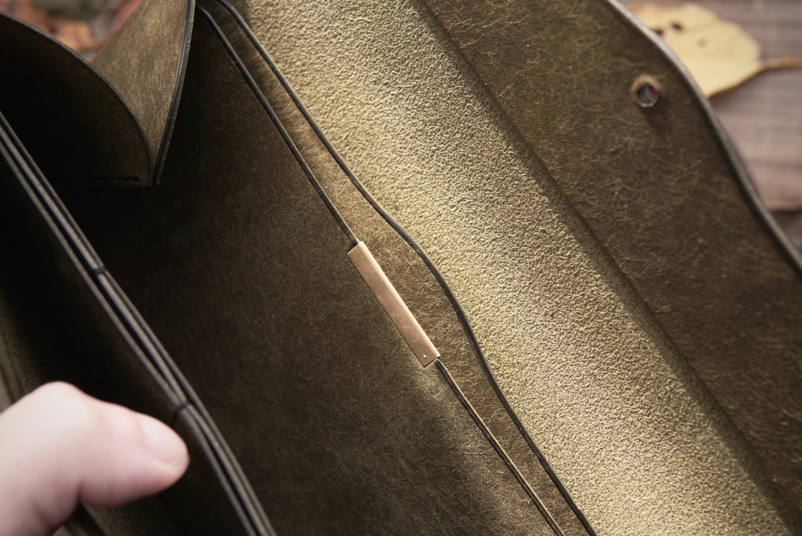 フラップの端を内側へ削ることで鞄内でかかる負荷が減る効果,そして中央の膨らみは親指をかけて開きやすいように設計しました。